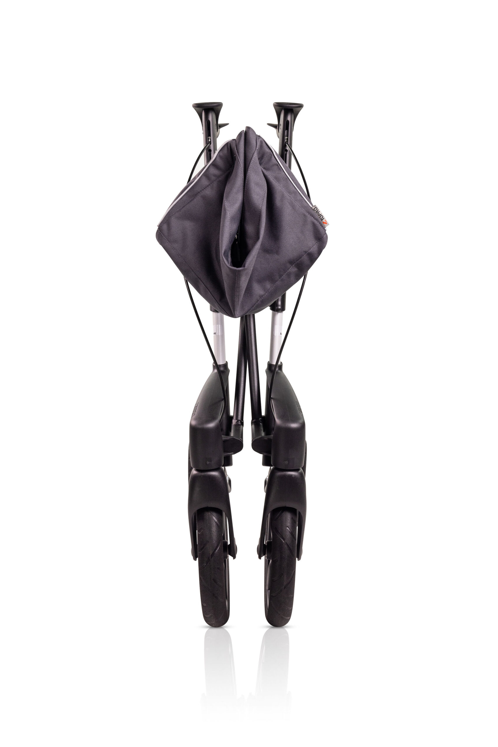 De zijdelingse vouwtechniek is eenvoudig met één hand te bedienen en maakt dat de rollator praktisch te vervoeren is. Ingevouwen blijft hij stevig op zijn wielen staan en neemt hij weinig ruimte in wanneer hij wordt opgeborgen.